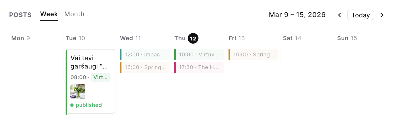 Posts are grounded in an actual publishing calendar, so teams can spot gaps, clashes, and cadence at a glance.